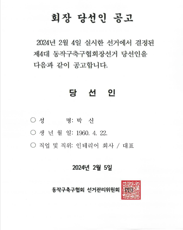 제4대 동작구축구협회 회장 당선인 공고