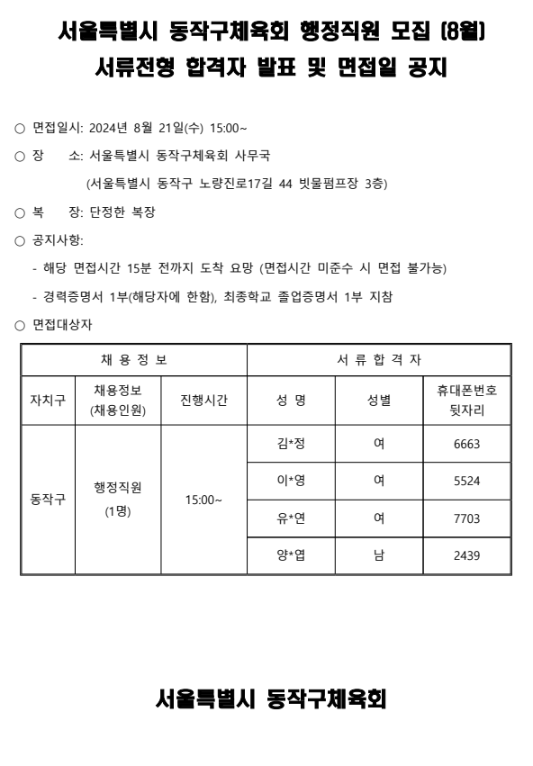 행정직원 모집(8월) 서류전형 합격자 발표 및 면접일 공지