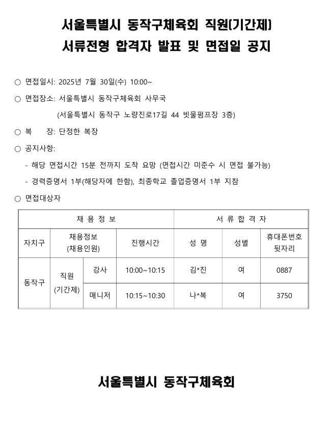 서울특별시 동작구체육회 직원(기간제) 서류전형 합격자 발표 및 면접일 공지