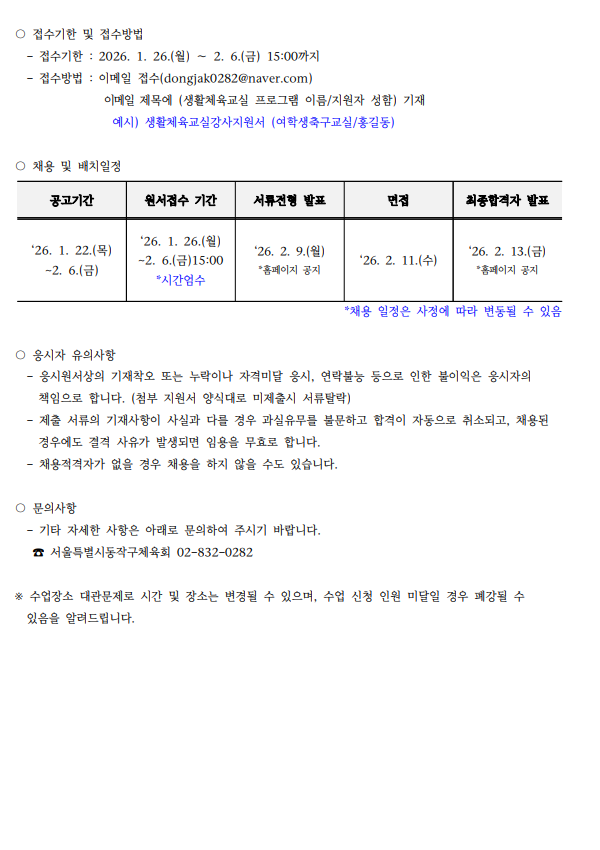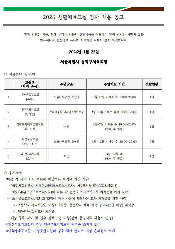 2026 생활체육교실 강사 채용공고 (축구, 풋살, 인라인, 요가, 배드민턴)