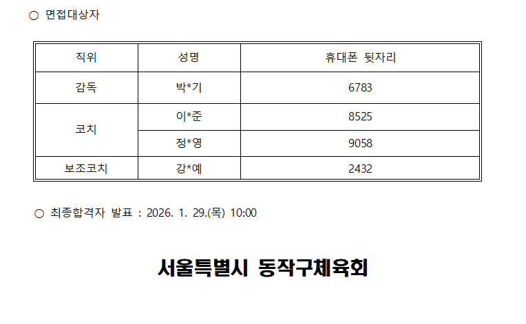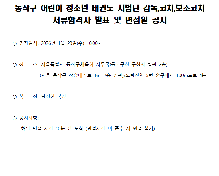 2026 동작구어린이.청소년 태권도시범단 감독 및 코치 서류 합격자 및 면접일 공지
