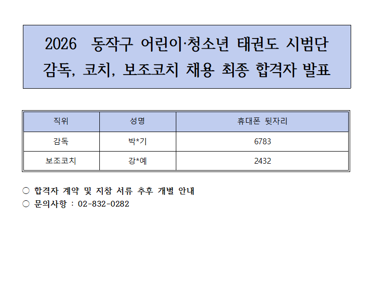 2026 동작구어린이.청소년 태권도시범단 감독 및 코치 최종 합격자 발표