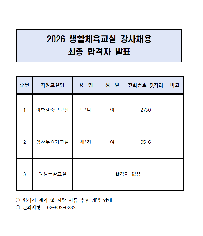 2026 생활체육교실 최종 합격자 발표
