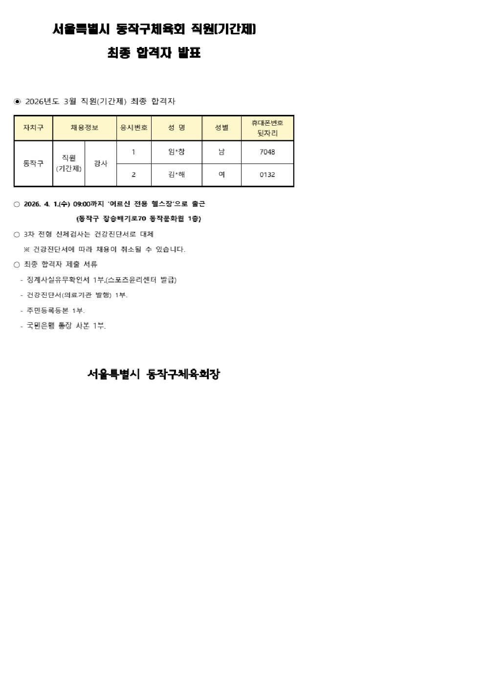 서울특별시 동작구체육회 직원(기간제) 최종 합격자 공고